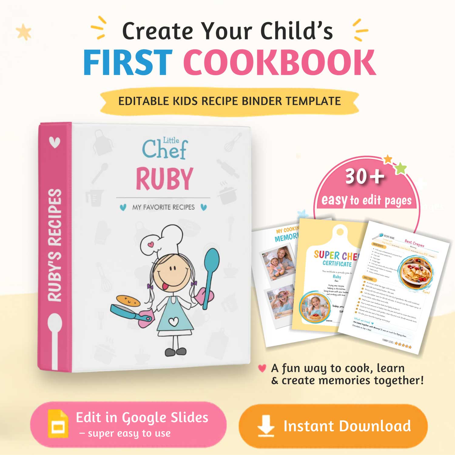 A fully editable Kids Recipe Binder Template (30+ pages) with clickable navigation that includes: